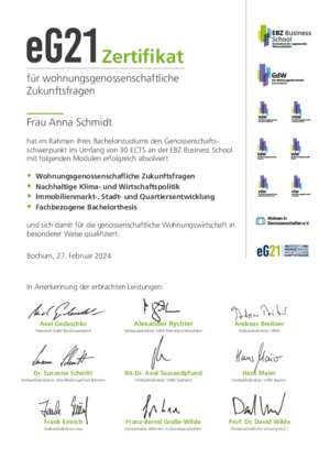 Auf die Belange der Wohnungsgenossenschaften zugeschnittenes Fachwissen muss her. Um dieses aufzubauen, bietet die EBZ Business School die Möglichkeit, im Rahmen ihrer Studienprogramme B.A. Real Estate und B.A. Real Estate Dual einen Genossenschaftsschwerpunkt zu absolvieren. In den Modulen „Wohnungsgenossenschaftliche Zukunftsfragen“, „Nachhaltige Klima- und Wirtschaftspolitik“ und „Immobilienmarkt-, Stadt- und Quartiersentwicklung“ werden die Studierenden speziell qualifiziert. Zudem muss die Abschlussarbeit zu einem genossenschaftsspezifischen Thema verfasst werden. Nach erfolgreichem Bestehen belegt ein in der Branche bisher einzigartiges Hochschulzertifikat die erworbene Qualifikation.