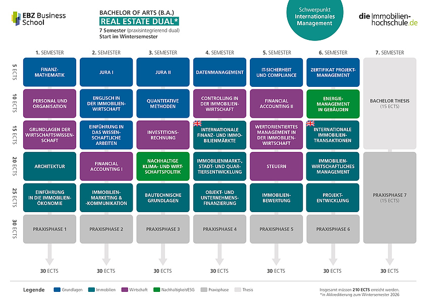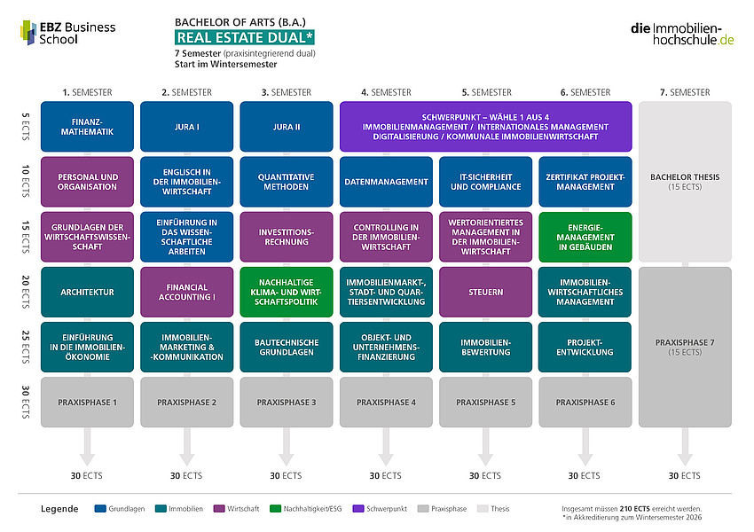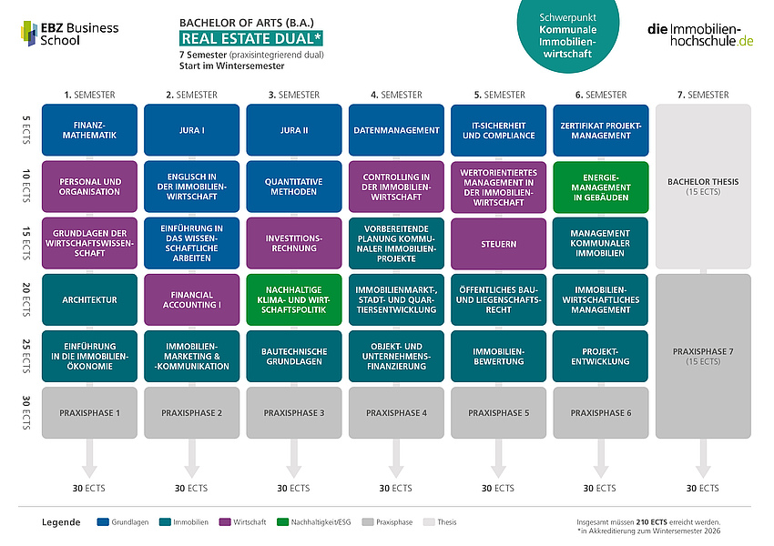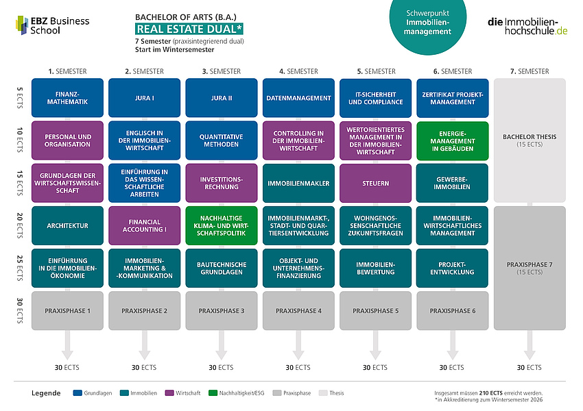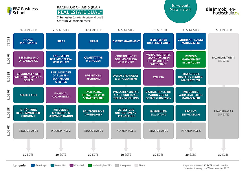 Dabei erstrecken sich die Praxisphasen über alle 7 Semester. Die Module gehören zu den Bereiche Grundlagen, Immobilien, Wirtschaft und Nachhaltigkeit/ESG.
